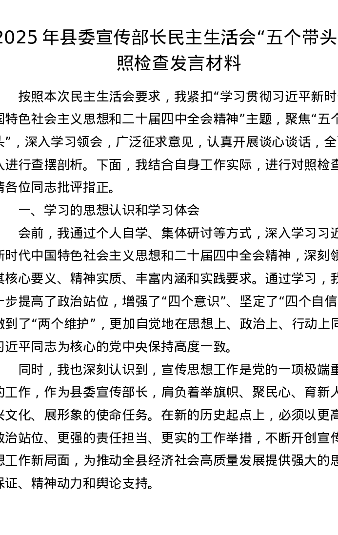 2025年县委宣传部长xxxxx五个带头对照检查发言材料