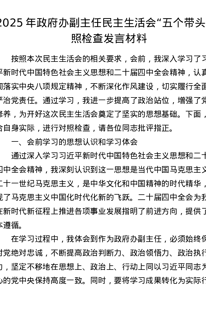 2025年政府办副主任xxxxx五个带头对照检查发言材料