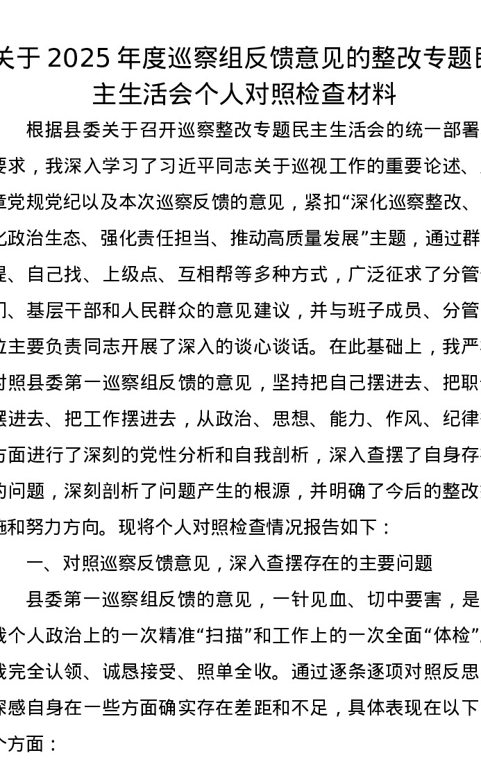 关于2025年度巡察组反馈意见的整改专题xxxxx个人对照检查材料