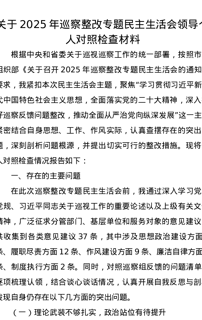 关于2025年巡察整改专题xxxxx领导个人对照检查材料
