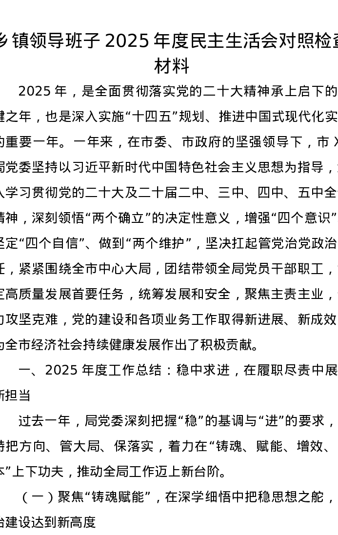 乡镇领导班子2025年度xxxxx对照检查材料