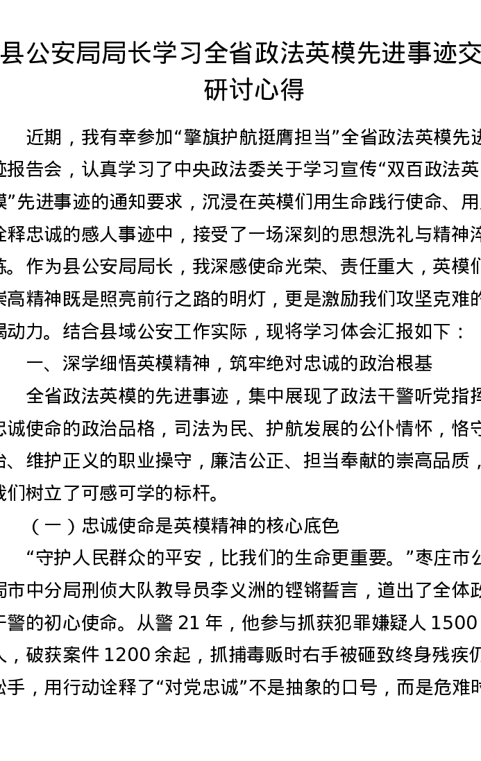 县公安局局长学习全省政法英模先进事迹交流研讨心得(4136字)