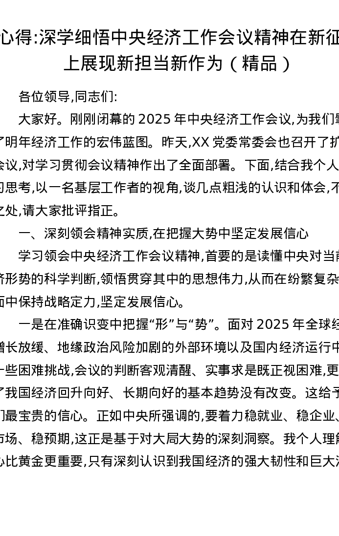 心得:深学细悟中央经济工作会议精神在新征程上展现新担当新作为