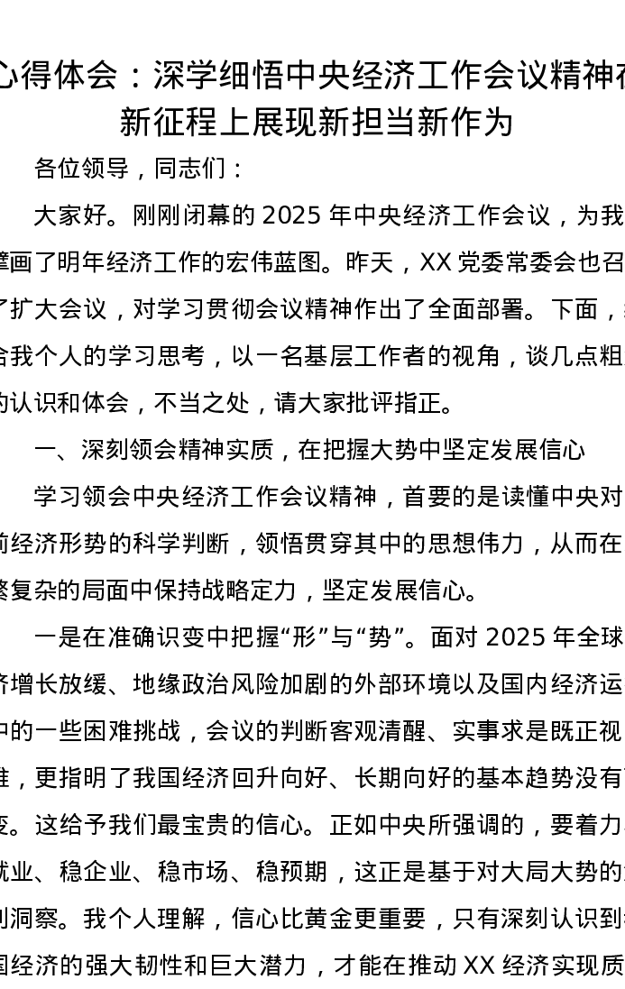 心得体会:深学细悟中央经济工作会议精神 在新征程上展现新担当新作为