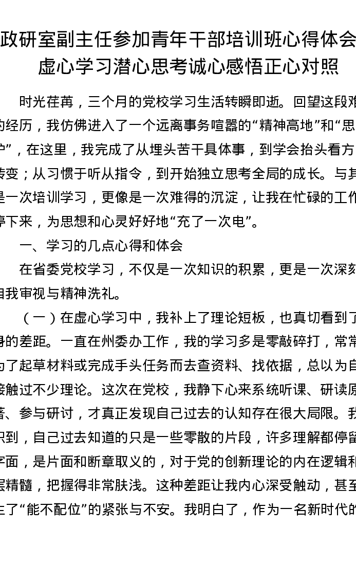政研室副主任参加青年干部培训班心得体会:虚心学习潜心思考诚心感悟正心对照