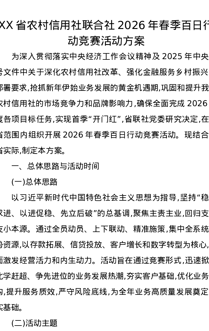 XX省农村信用社联合社2026年春季百日行动竞赛活动方案