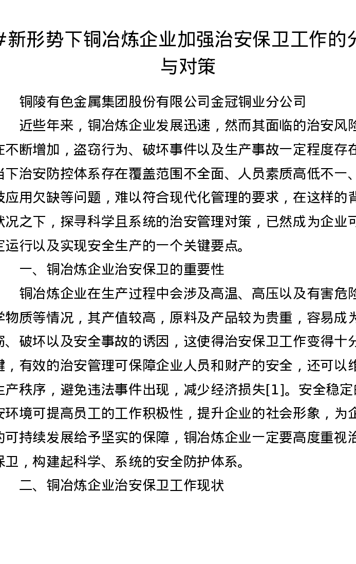 调研报告:新形势下铜冶炼企业加强治安保卫工作的分析与对策