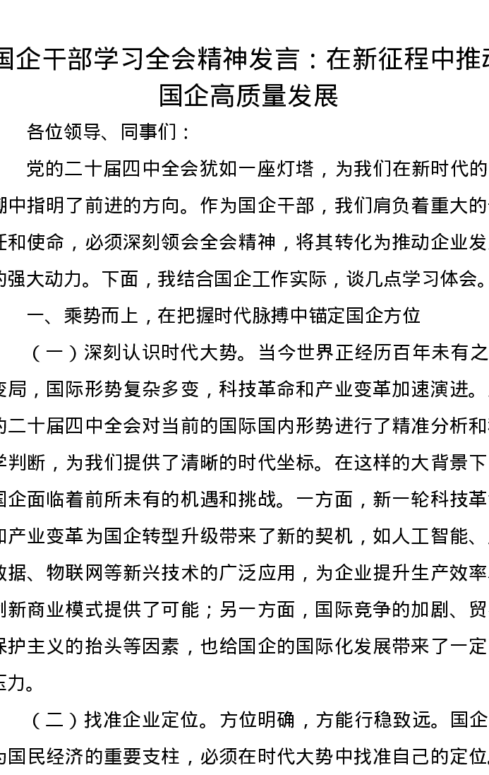 国企干部学习全会精神发言:在新征程中推动国企高质量发展