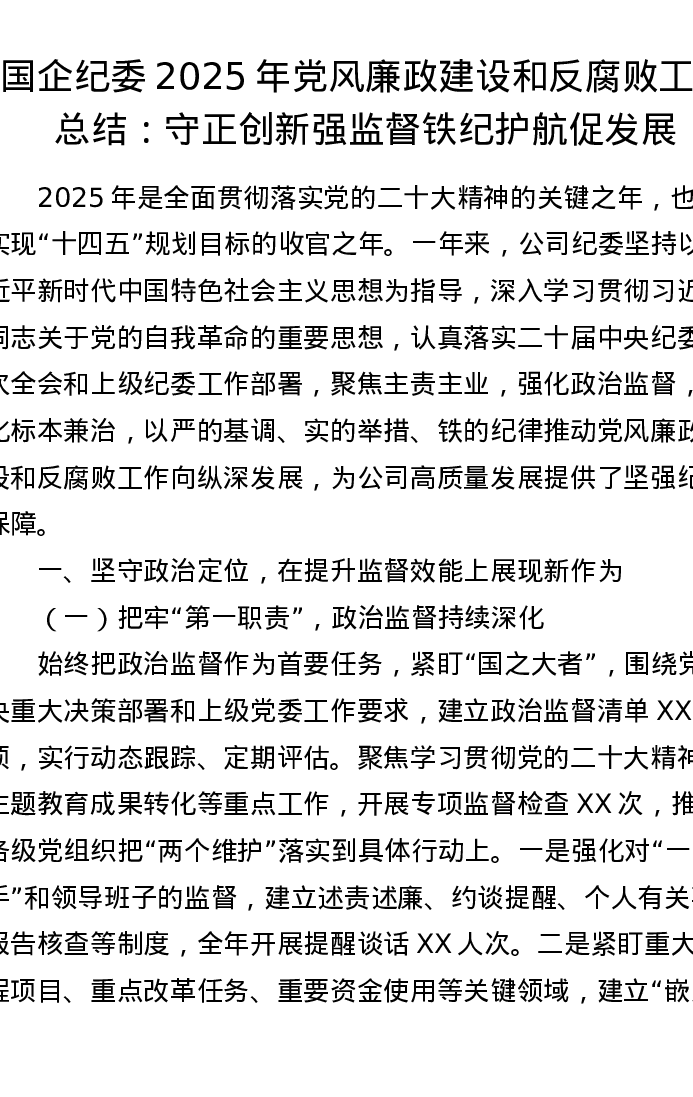 国企纪委2025年党风廉政建设和反腐败工作总结:守正创新强监督 铁纪护航促发展