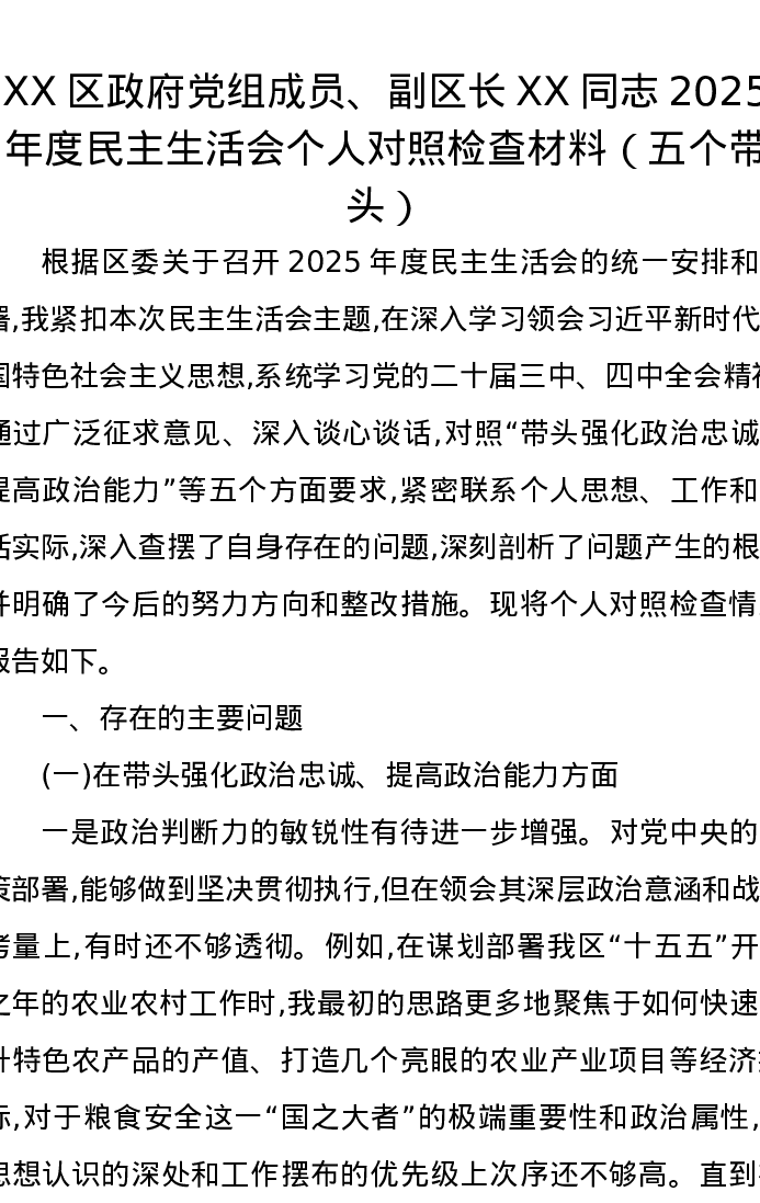 XX区政府党组成员、副区长XX同志2025年度民主生活会个人对照检查材料(五个带头)