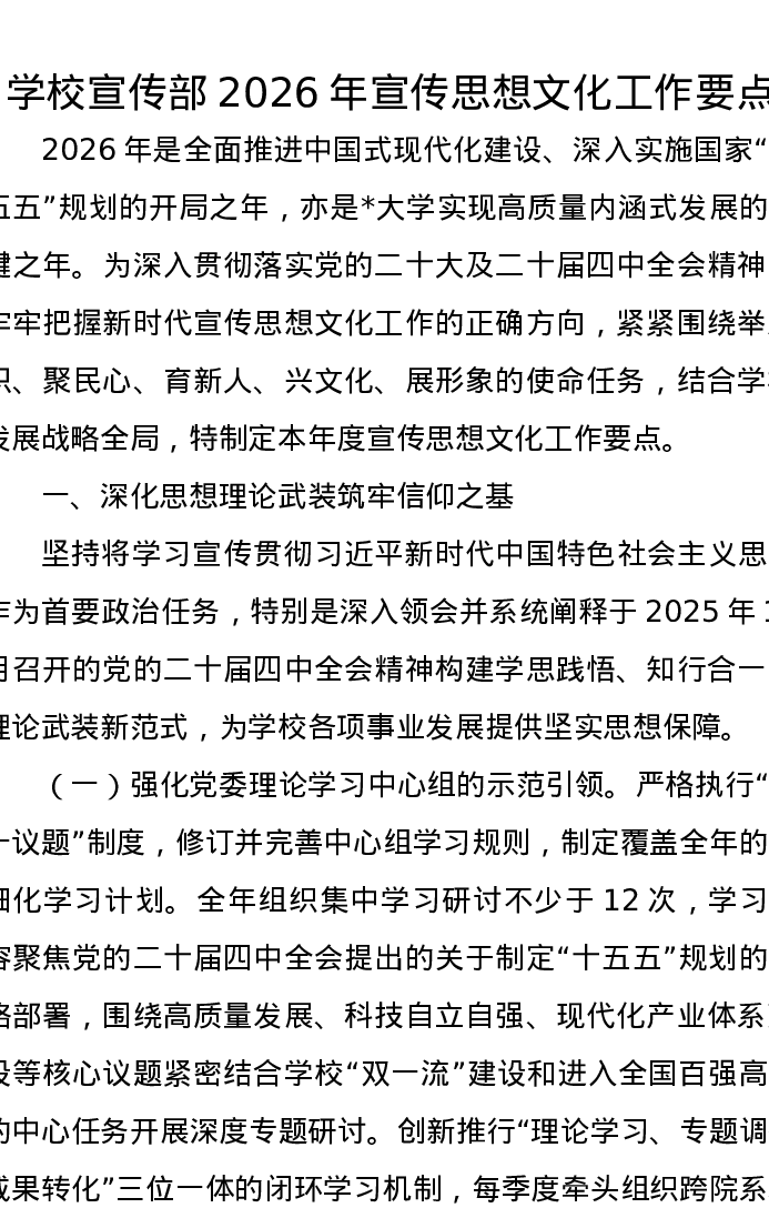 学校宣传部2026年宣传思想文化工作要点