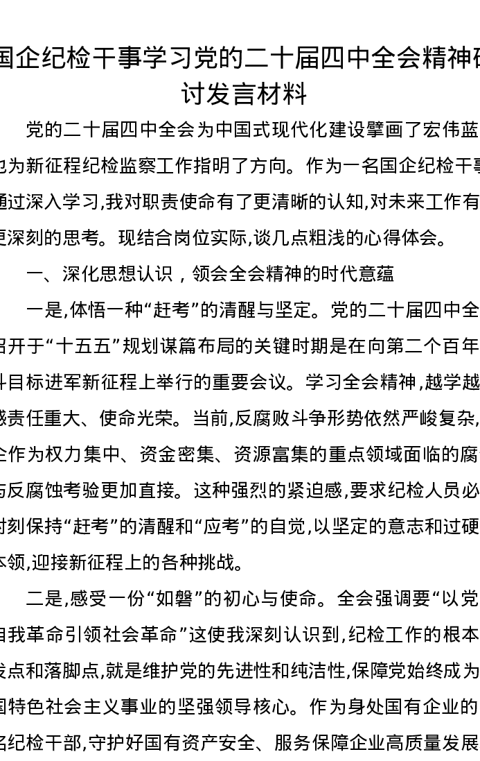 国企纪检干事学习党的二十届四中全会精神研讨发言材料