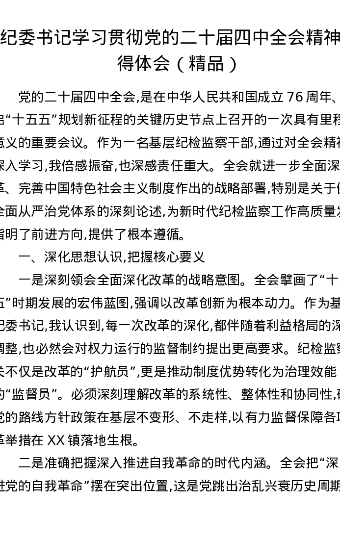 纪委书记学习贯彻党的二十届四中全会精神心得体会