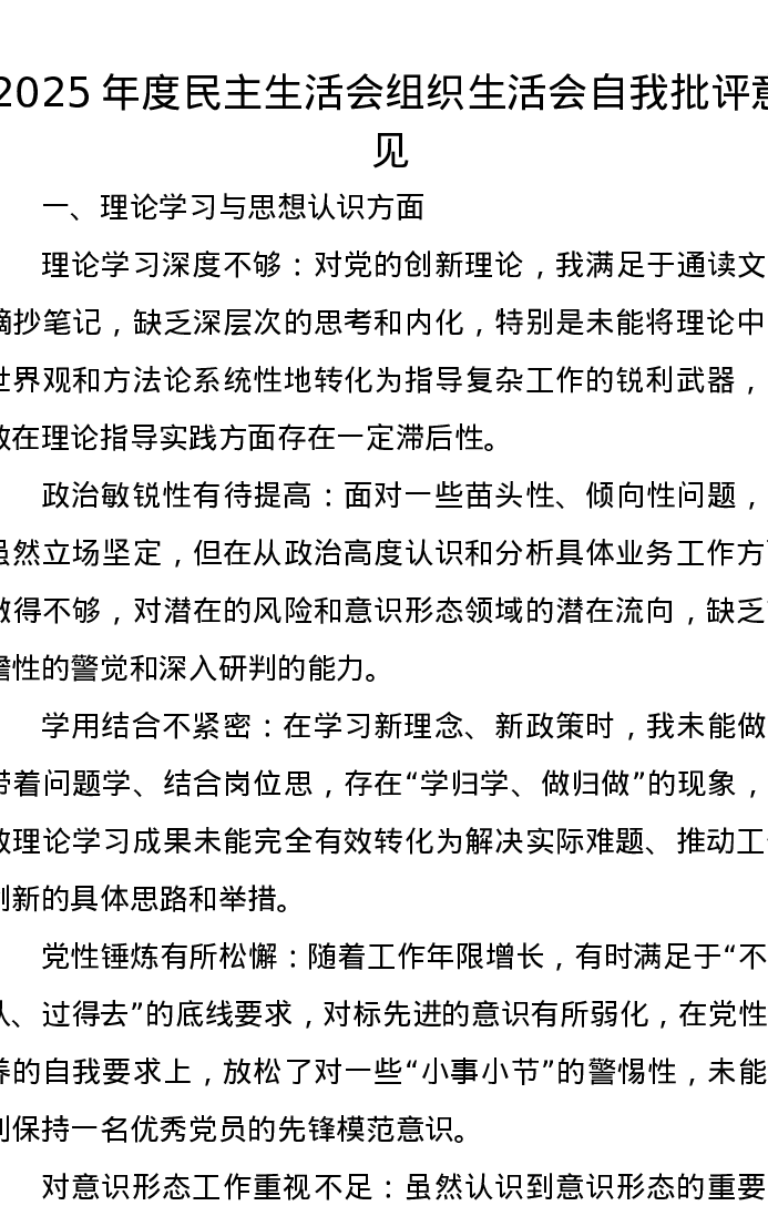 2025年度xxxxx组织xxx自我批评意见