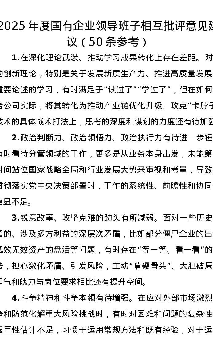 2025年度国有企业领导班子相互批评意见建议(50条参考)