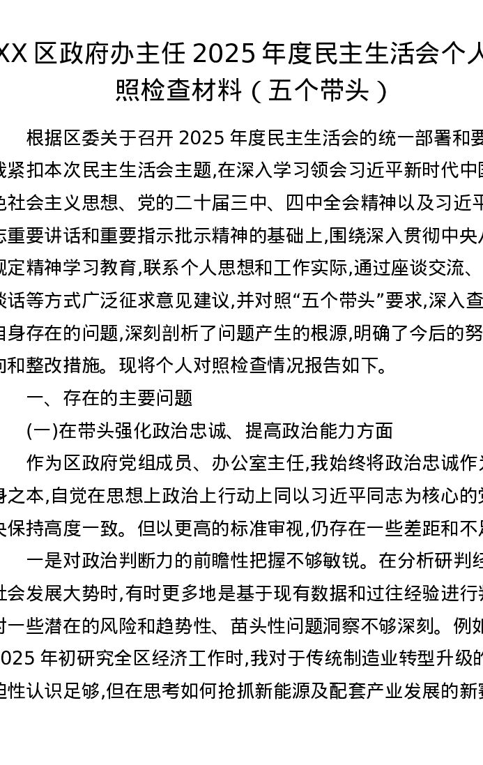 XX区政府办主任2025年度五个带头xxxxx个人对照检查材料