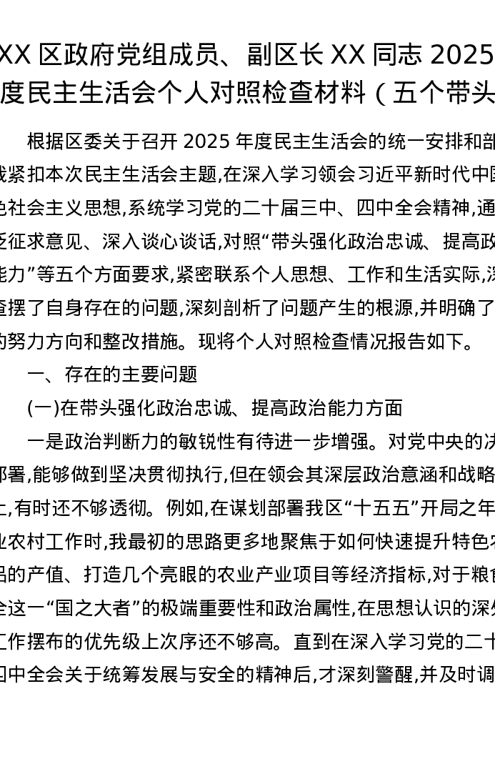 XX区政府党组成员、副区长XX同志2025年度五个带头xxxxx个人对照检查材料