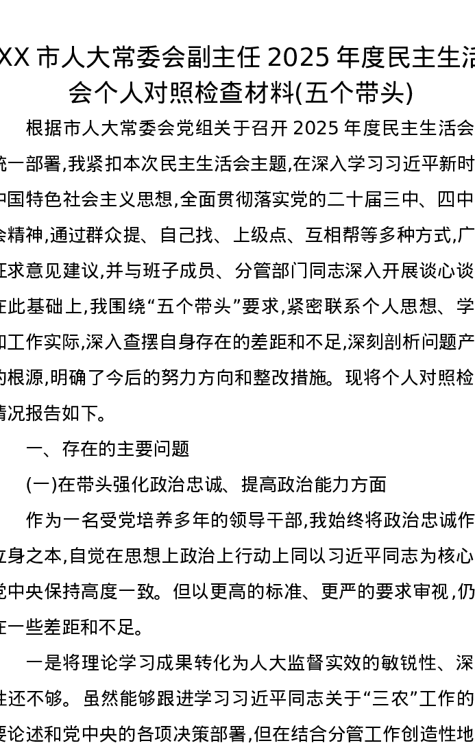XX市人大常委会副主任2025年度xxxxx个人对照检查材料(五个带头)