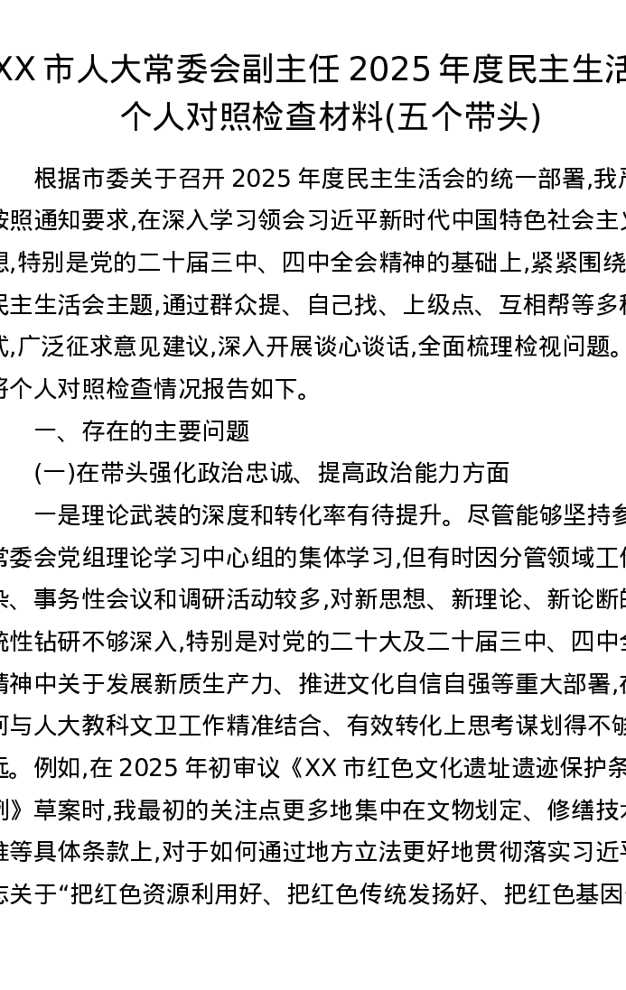 XX市人大常委会副主任2025年度五个带头xxxxx个人对照检查材料