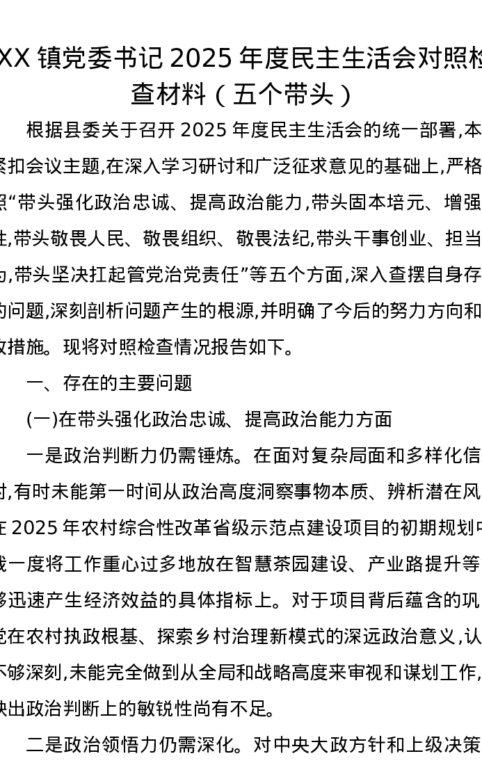 XX镇党委书记2025年度xxxxx对照检查材料(五个带头)