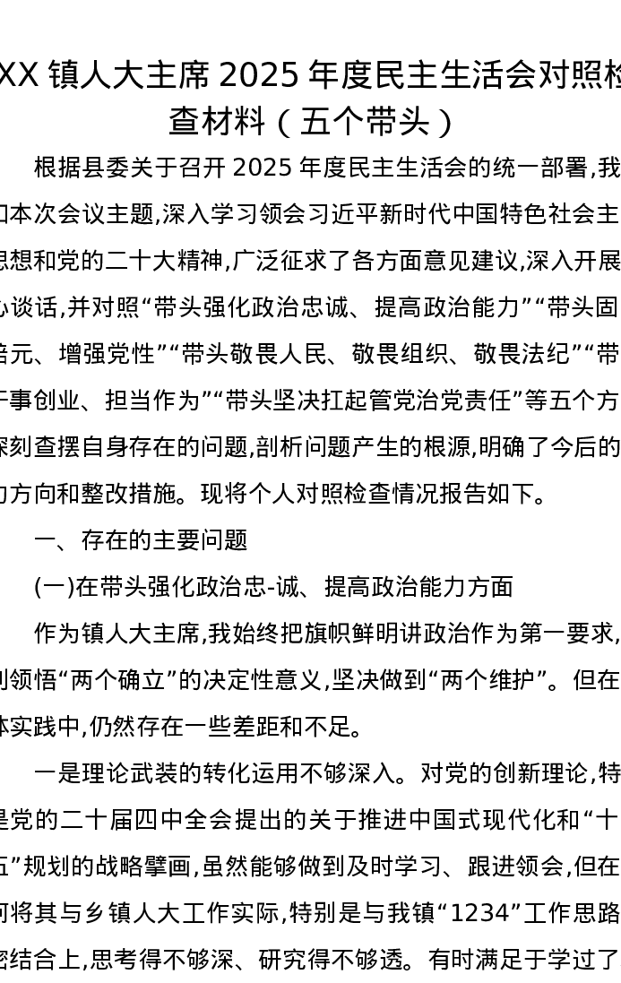 XX镇人大主席2025年度xxxxx对照检查材料(五个带头)