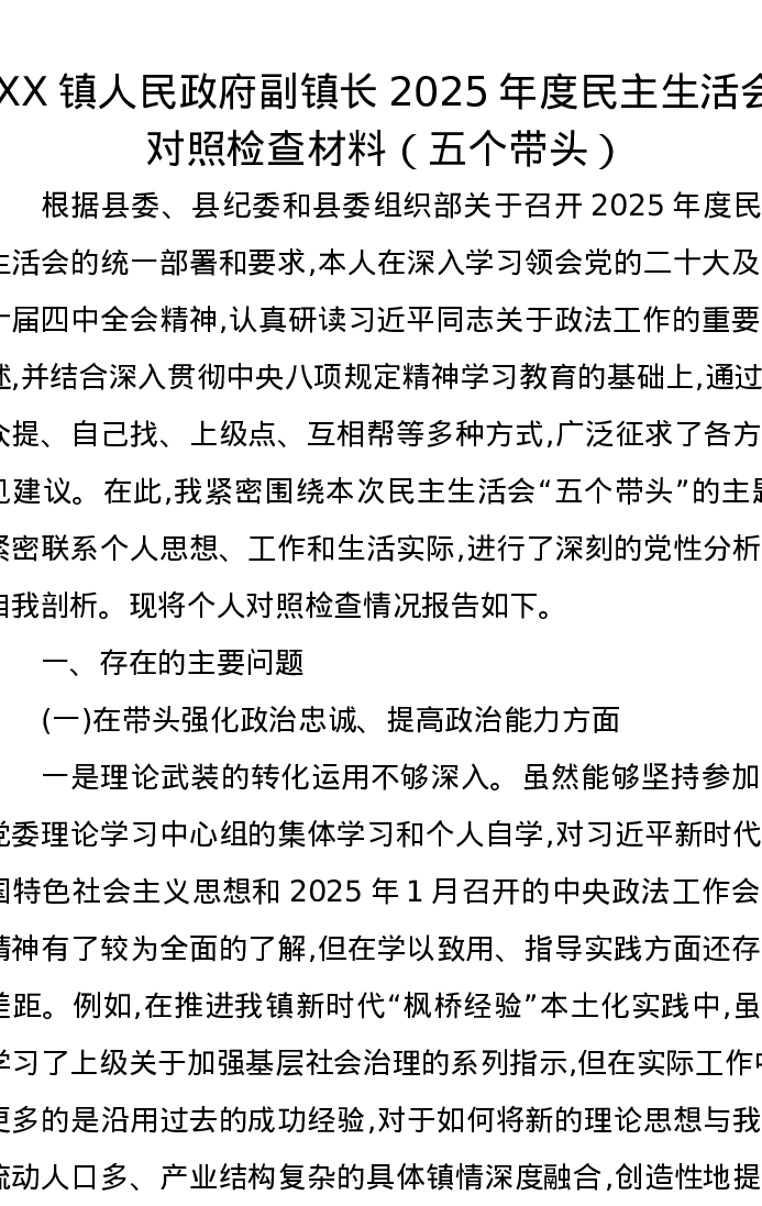 XX镇人民政府副镇长2025年度xxxxx对照检查材料(五个带头)