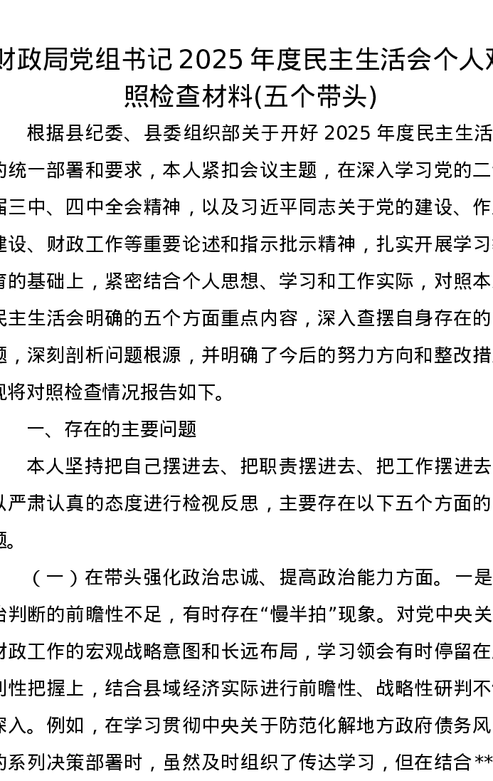 财政局党组书记2025年度xxxxx个人对照检查材料(五个带头)