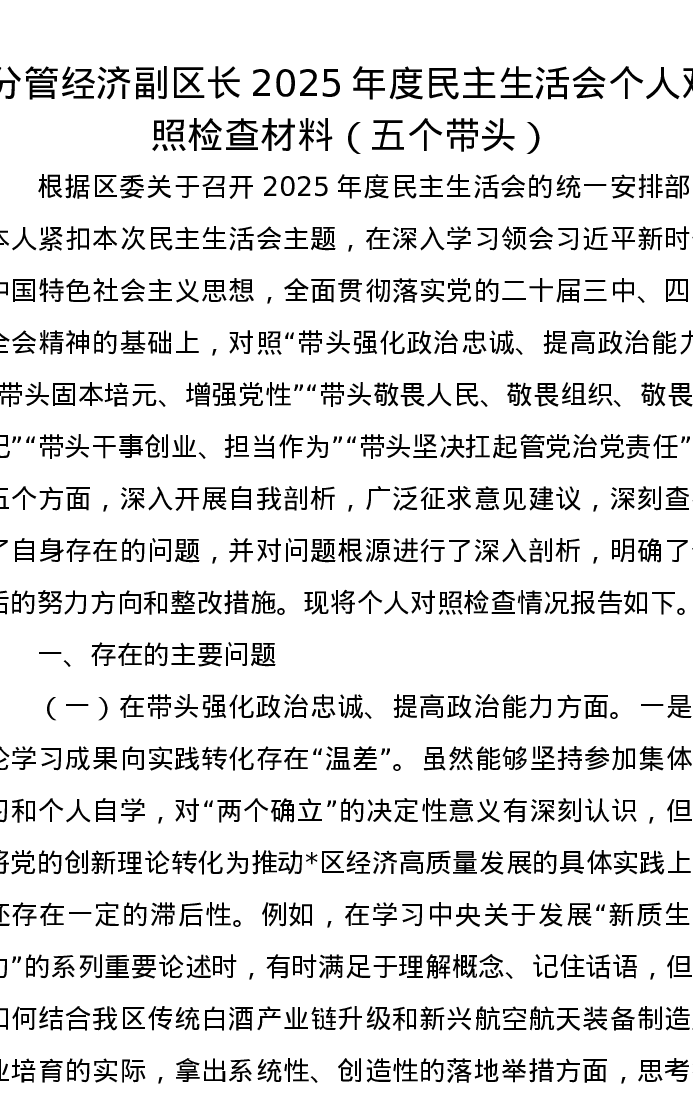 分管经济副区长2025年度五个带头xxxxx个人对照检查材料
