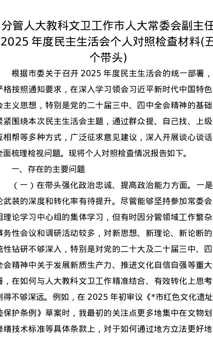 分管人大教科文卫工作市人大常委会副主任2025年度五个带头xxxxx个人对照检查材料)