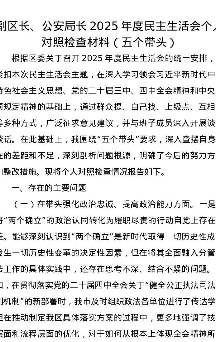 副区长、公安局长2025年度xxxxx个人对照检查材料(五个带头)