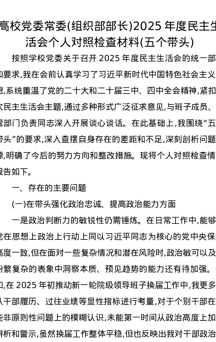 高校党委常委(组织部部长)2025年度xxxxx个人对照检查材料(五个带头)