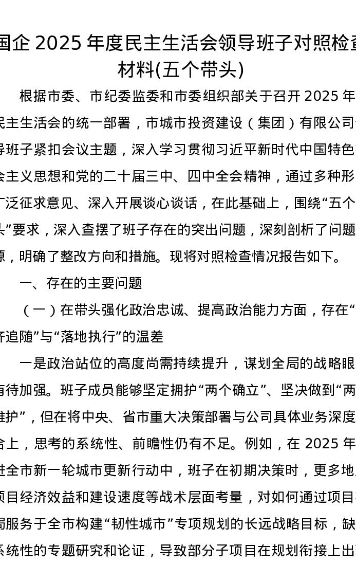 国企2025年度xxxxx领导班子对照检查材料(五个带头)