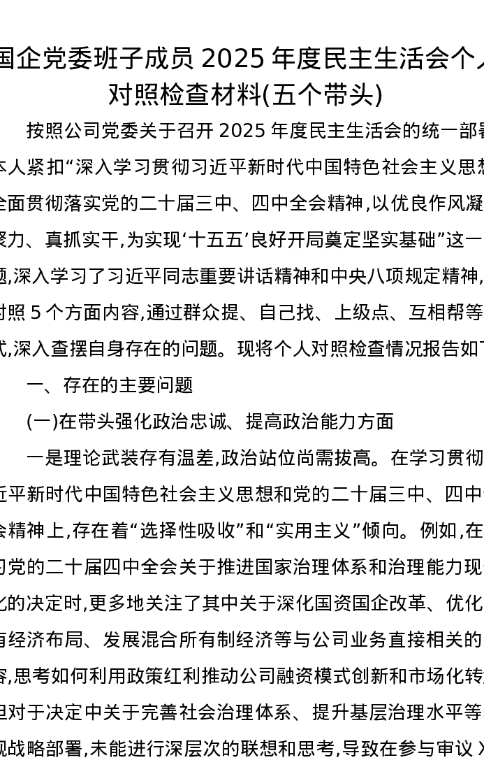 国企党委班子成员2025年度xxxxx个人对照检查材料(五个带头)
