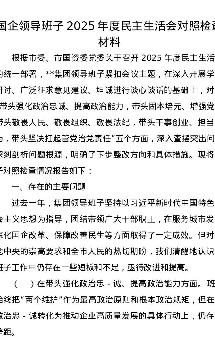 国企领导班子2025年度xxxxx对照检查材料(五个带头)