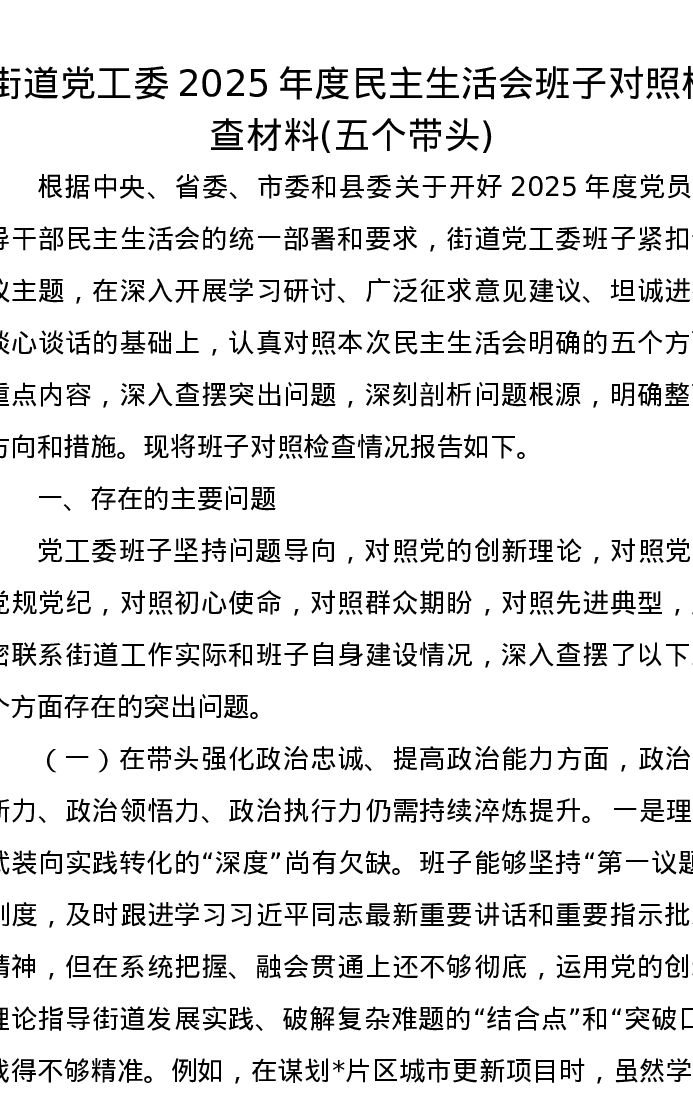 街道党工委2025年度xxxxx班子对照检查材料(五个带头)