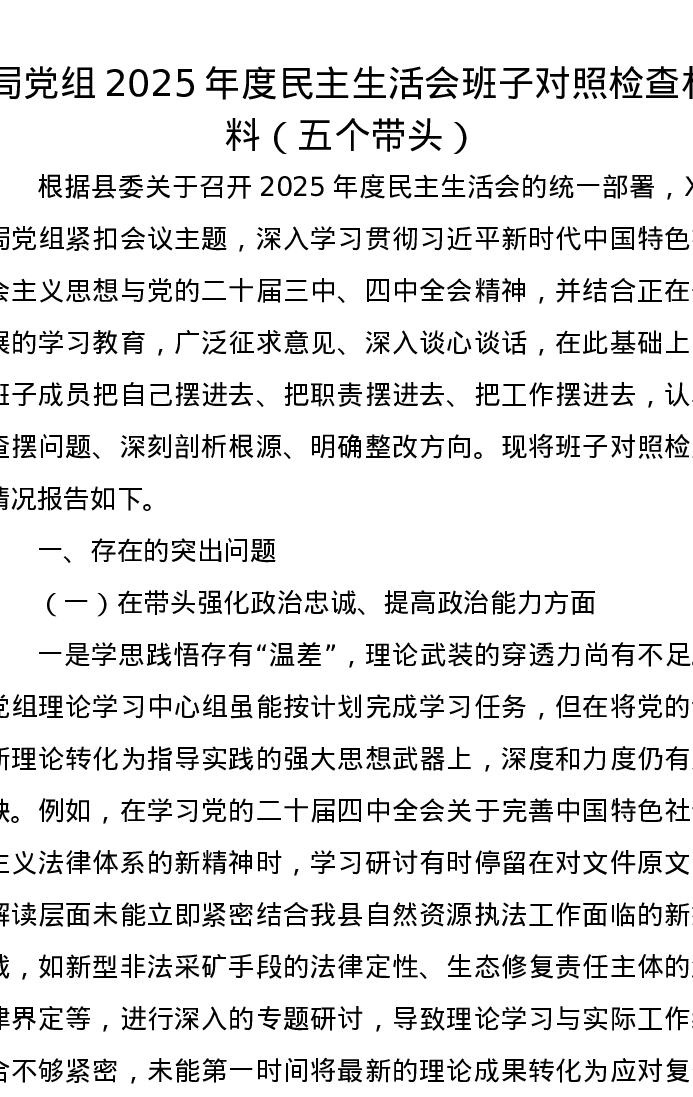 局党组2025年度xxxxx班子对照检查材料(五个带头)