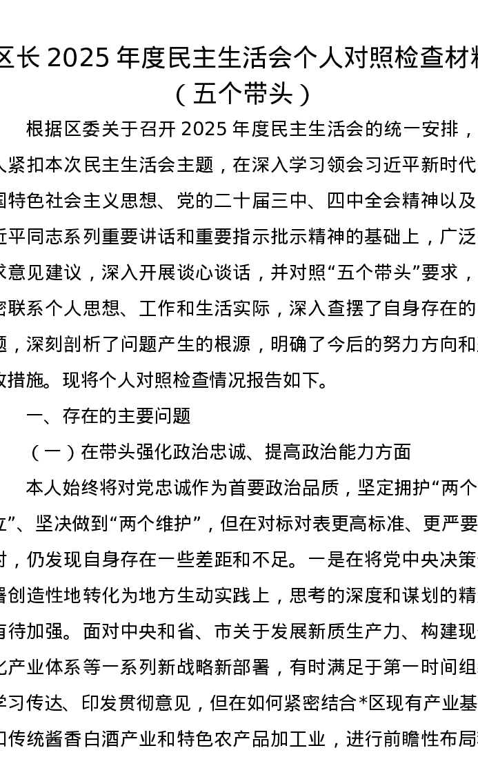 区长2025年度xxxxx个人对照检查材料(五个带头)