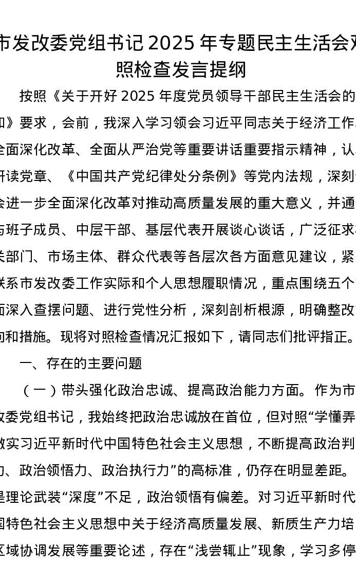 市发改委党组书记2025年专题xxxxx对照检查发言提纲(五个带头)