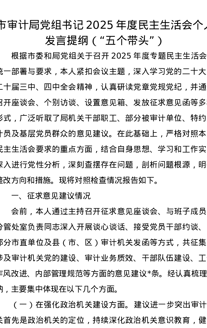 市审计局党组书记2025年度xxxxx个人发言提纲(五个带头)