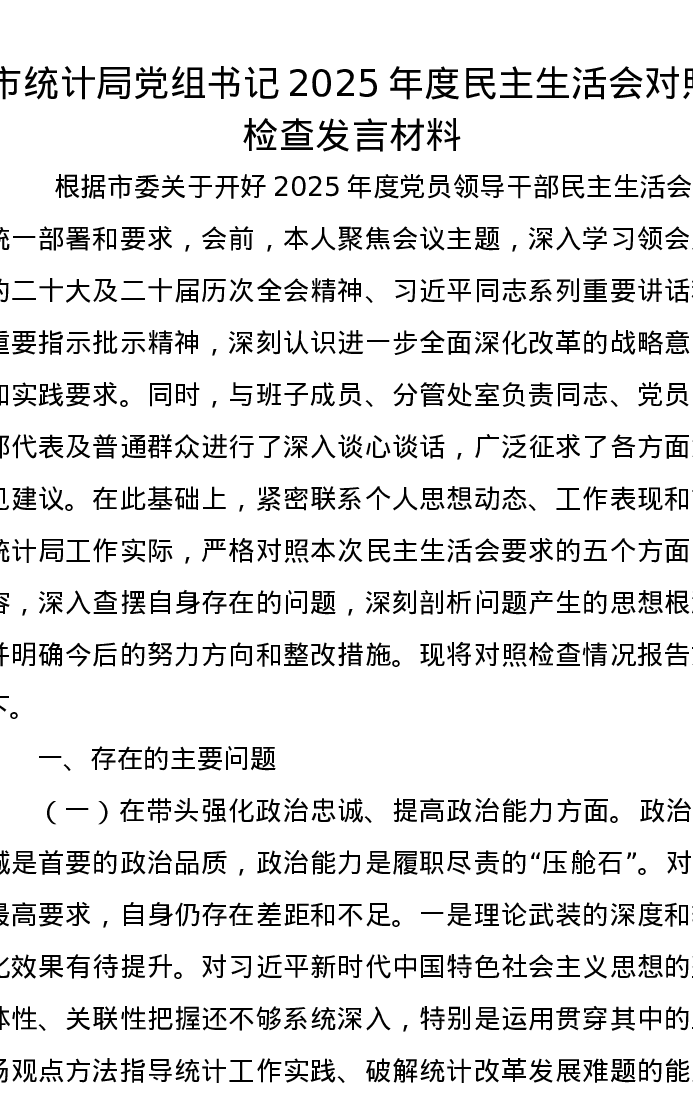 市统计局党组书记2025年度xxxxx对照检查发言材料