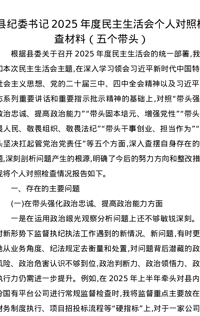 县纪委书记2025年度xxxxx个人对照检查材料(五个带头)