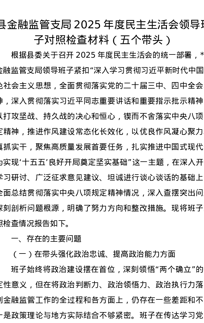 县金融监管支局2025年度xxxxx领导班子对照检查材料(五个带头)