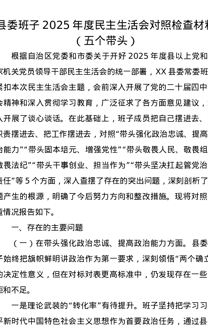 县委班子2025年度xxxxx对照检查材料(五个带头)