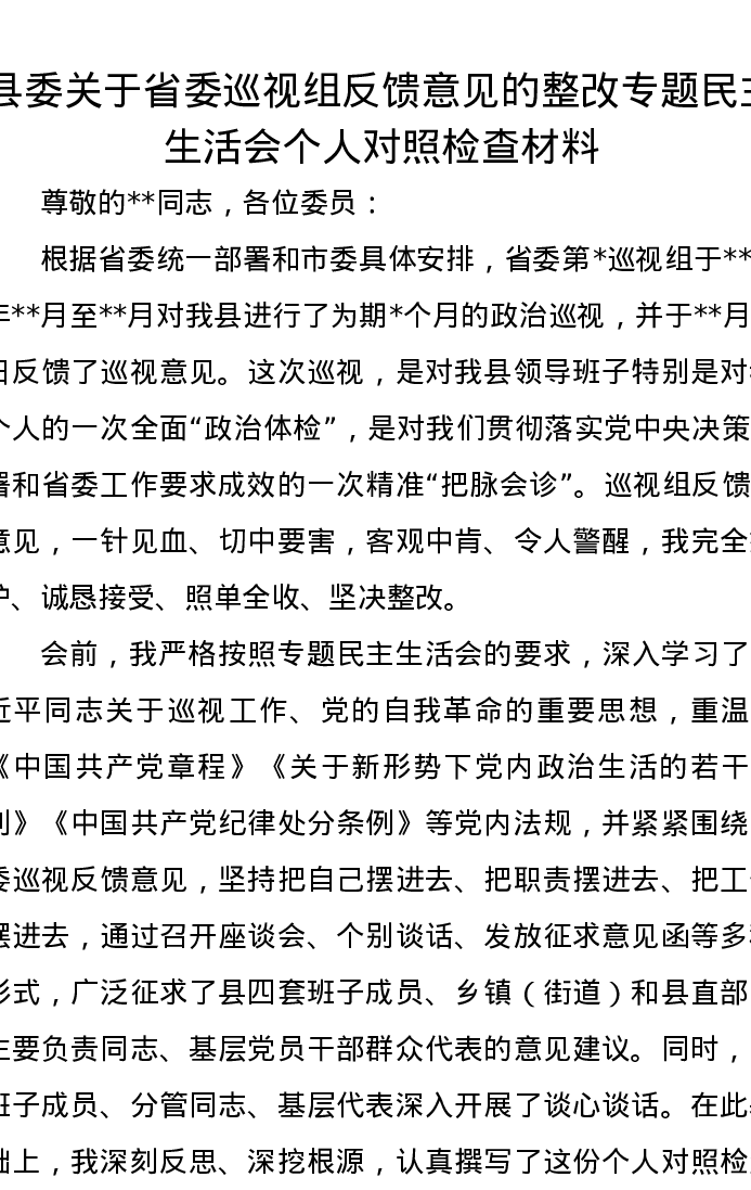 县委关于省委巡视组反馈意见的整改专题xxxxx个人对照检查材料