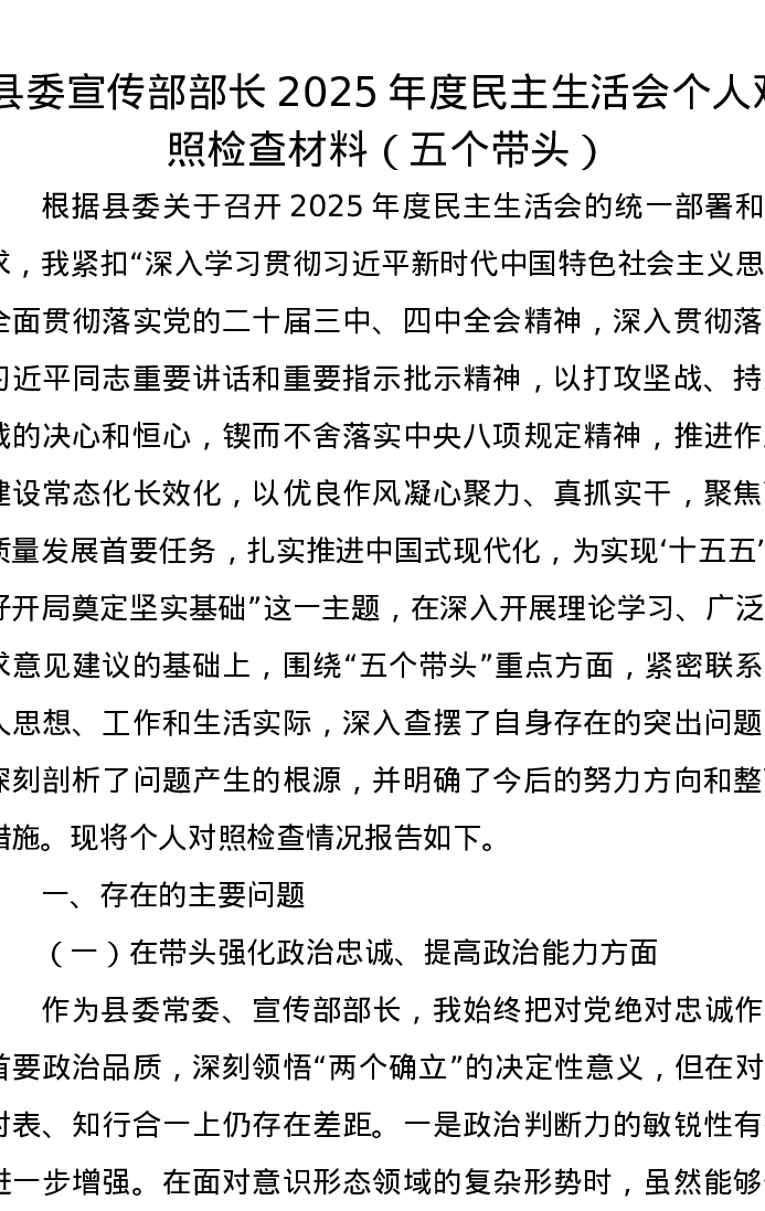 县委宣传部部长2025年度五个带头xxxxx个人对照检查材料