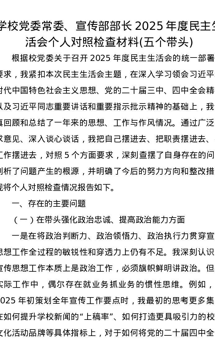 学校党委常委、宣传部部长2025年度xxxxx个人对照检查材料(五个带头)