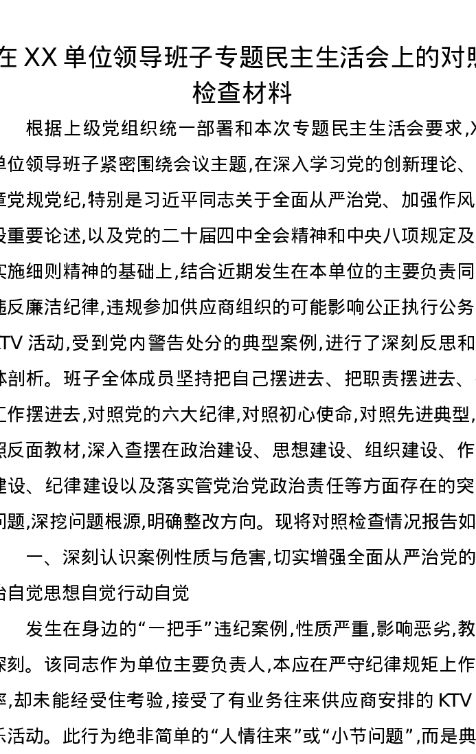 在XX单位领导班子专题xxxxx上的对照检查材料