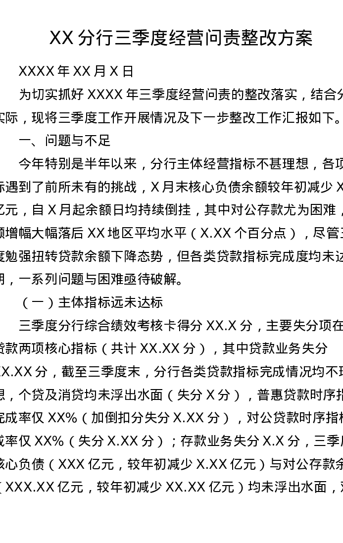 XX分行三季度经营问责整改方案