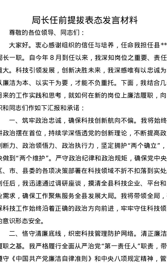 局长任前提拔表态发言材料