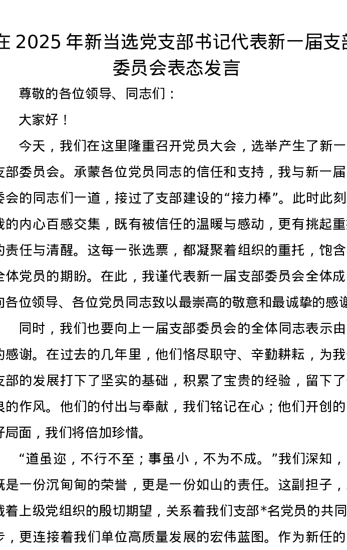 在2025年新当选党支部书记代表新一届支部委员会表态发言